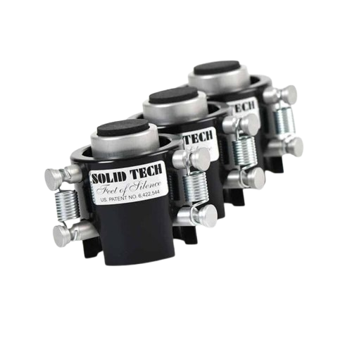 Solid Tech Feet of Silence may be the finest isolation devices of their kind. The design allows for movement in both the horizontal and vertical planes. These can be used in a wide variety of equipment installations, not just Solid Tech racks. The suspension rings may be switched to accommodate heavier components (alternate heavy-duty springs are available separately).